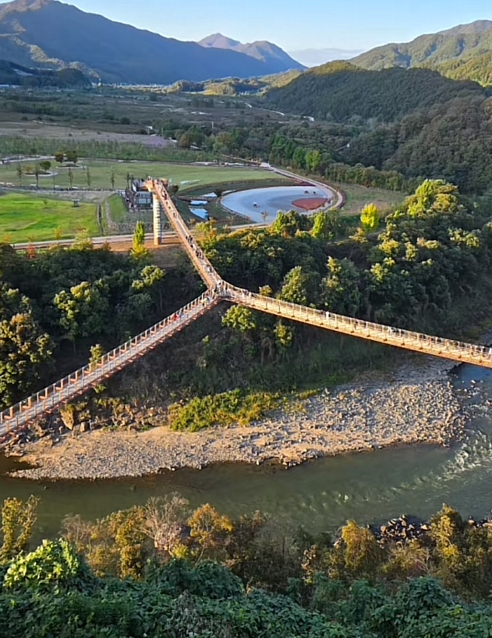 抱川Y字形吊橋橫跨峽谷,三向分岔設計獨特,可俯瞰壯麗山景與溪谷,行走時微微搖晃,充滿刺激與趣味。