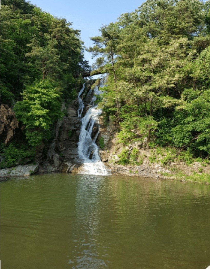 京畿道抱川山井湖旁的鴿子瀑布,瀑水從岩壁奔流而下,四季景色各異,清涼秀麗,是散步與攝影的好去處。